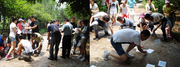 第二个项目是“定向寻宝”,任务是每个小组(两人)按照司令部的指示,在一张神秘行军图的指引下,经过4次在指定地点的神秘接头,找到自己同属一个团队的同伴。 等司令发放“行动密令”信封后,我们各自组建起来的两人组就出发了,拿着我们的宝藏图和地图表就知道这次的任务不那么简单了,途中要仔细辨别、认真核实宝藏地和前进道路,在中途的时候也产生了一些意见分歧,但是经过耐心沟通、协调,还是找到了正确的前进方向。