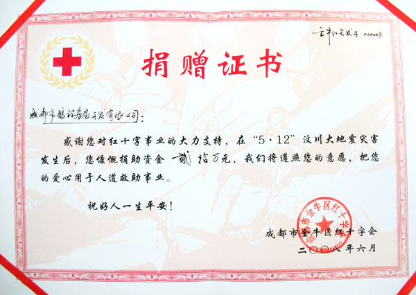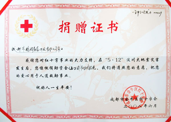 5月15日,公司在发出倡议书,全体员工积极捐款,公司和员工个人捐款共计252920.00元整,并在第一时间由公司董事长、总经理亲自将这笔捐款送到成都市金牛区红十字会用于5.12汶川大地震的赈灾救助。